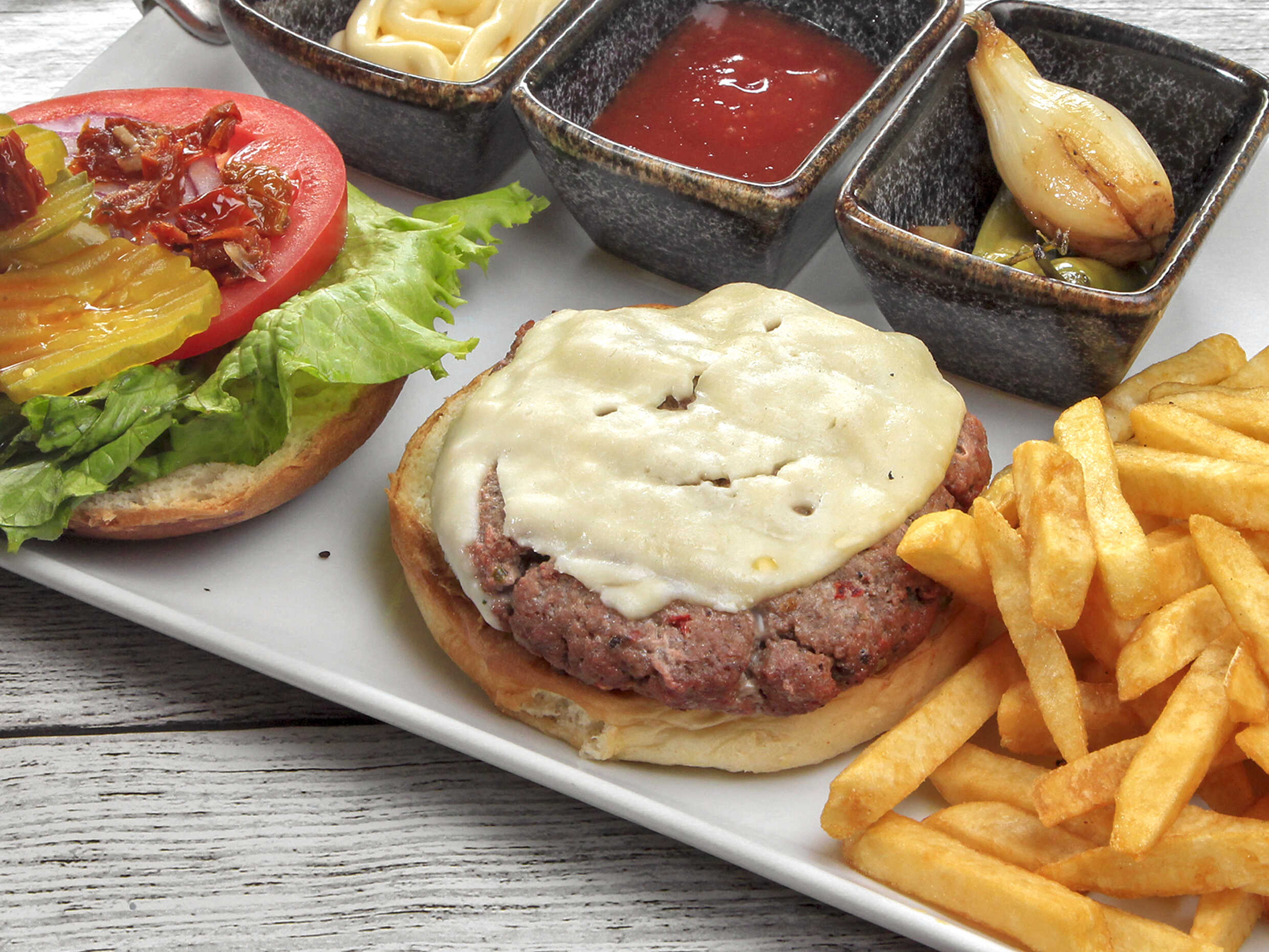 Rib eye 250 gr provolone ahumado, portobello tomate deshidratado, jitomate, lechuga italiana y cebolla caramelizada