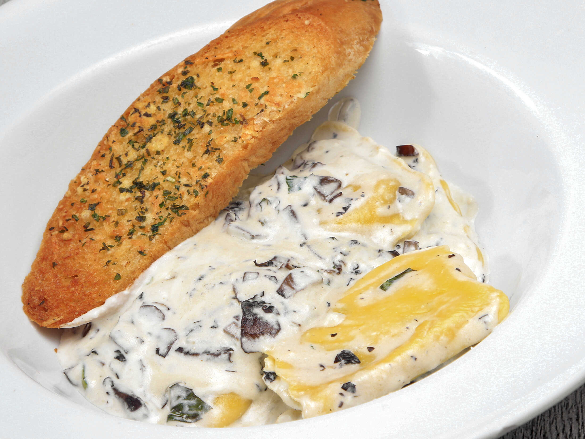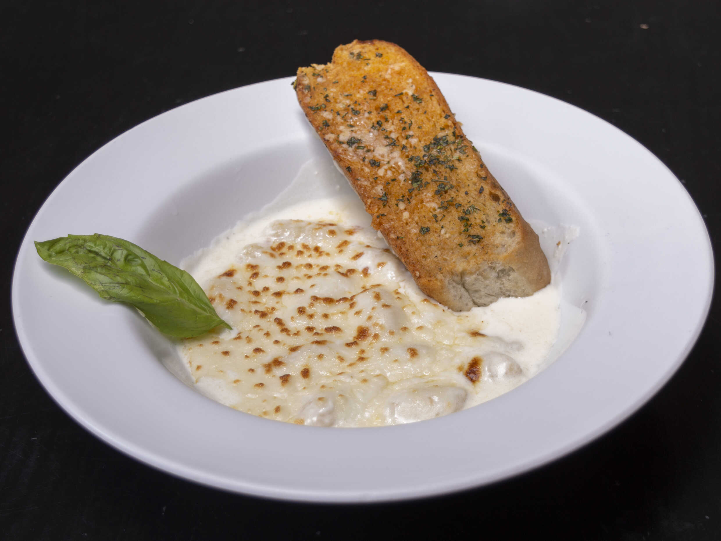 Pasta hecha en casa a base de papa, en salsa de cuatro quesos.