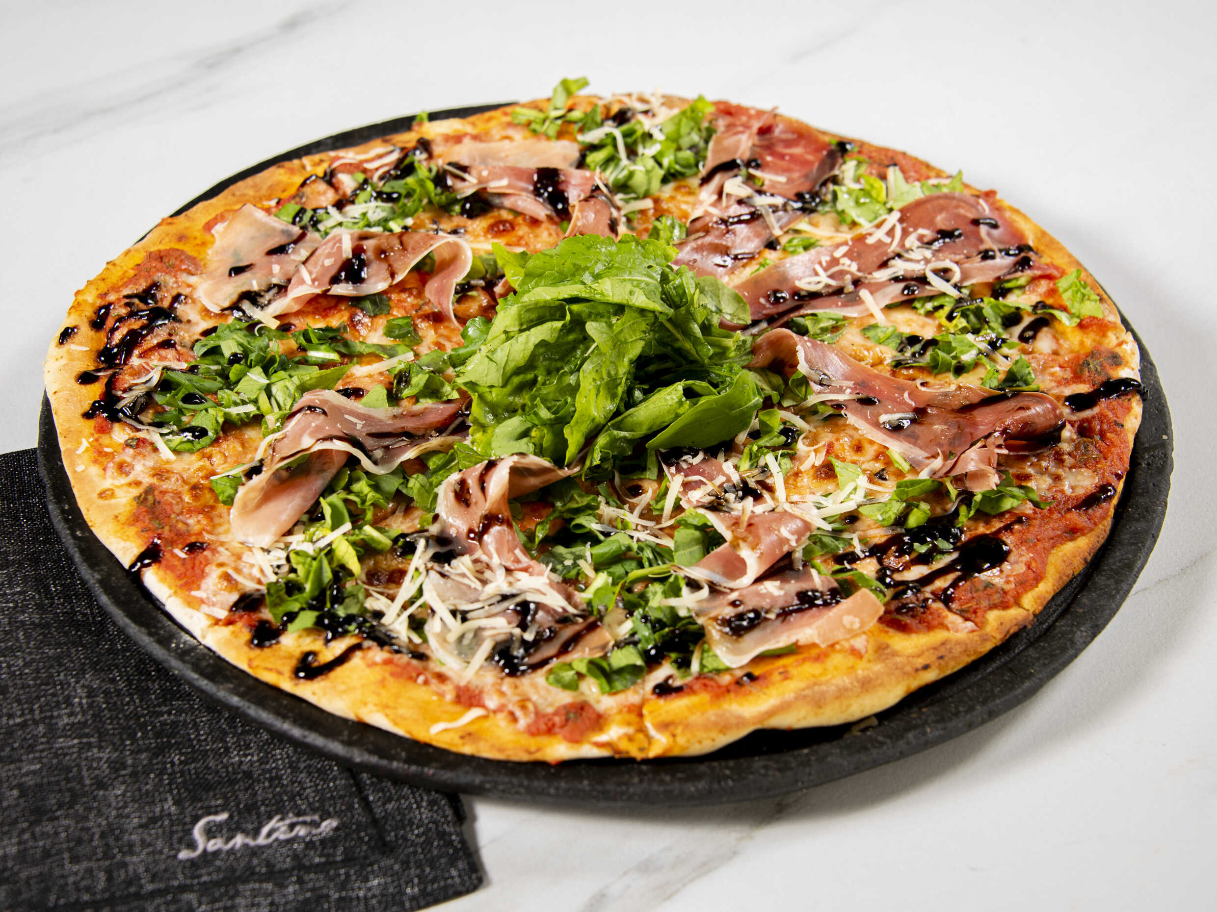 Queso, rúcula marinada en balsámico y láminas de prosciutto fresco.