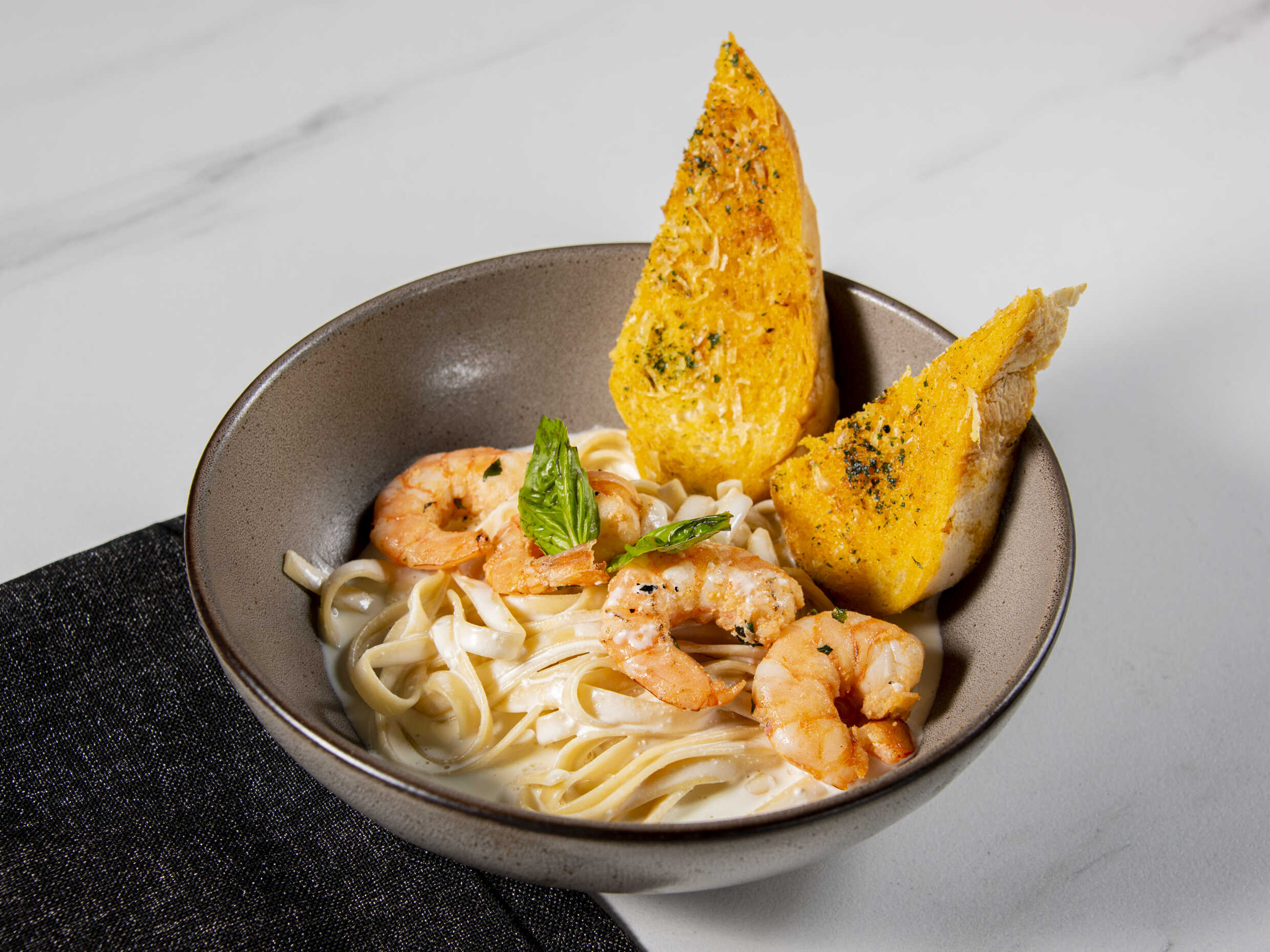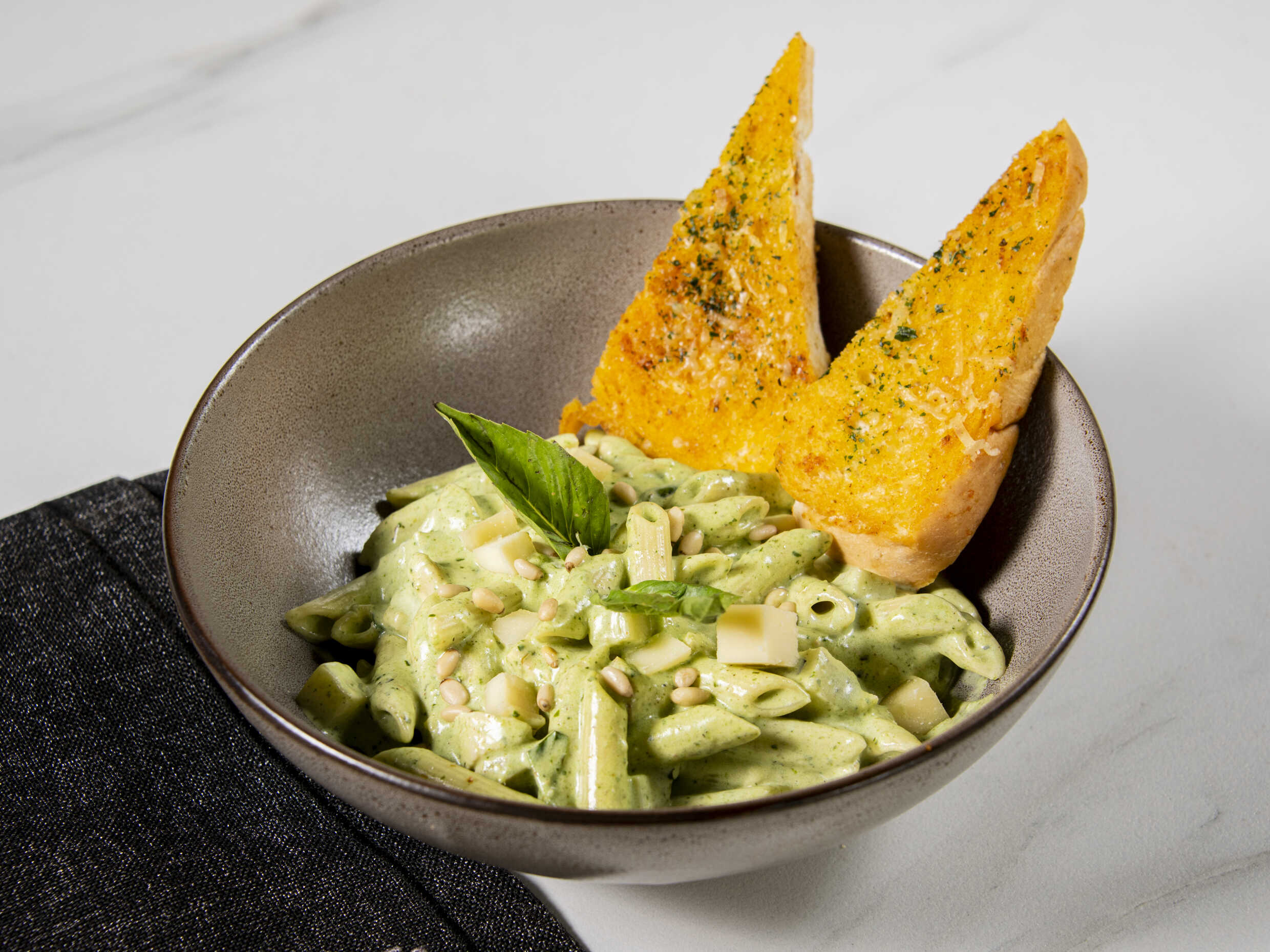 Pasta corta con queso provolone, pesto, ligeramente cremosa con pollo a la parrilla.