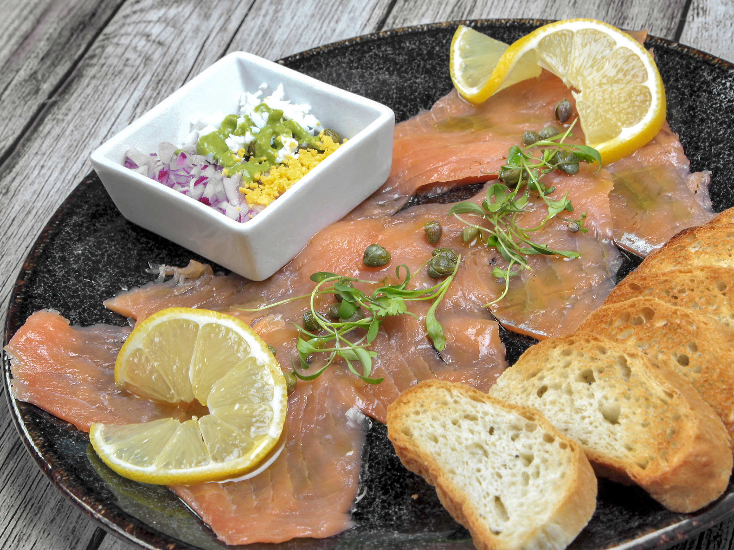 Láminas de filete de res sterling silver, parmesano, aceite de olivo, rúcula, berros y reducción de pesto.
