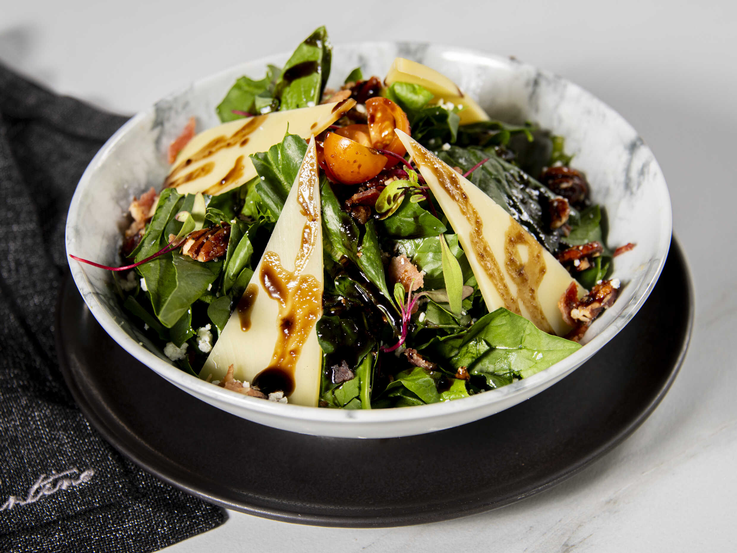 Espinacas, tocino, nuez caramelizada, balsamico y parmesano.
