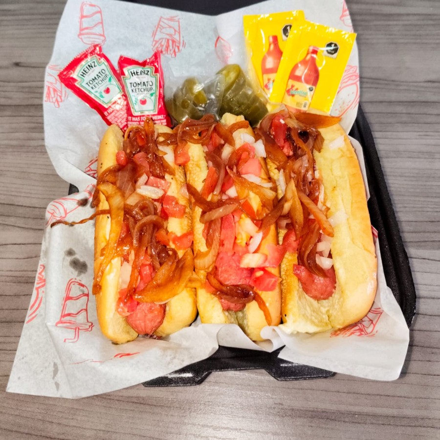 Perfecto para compartir, Tres hot-dogs, a escoger (tradicional, tocino ,hawaiano) acompañados con verduras frescas deliciosos aderezos ,BBQ,capsup,mostaza,salsa picante,chiles