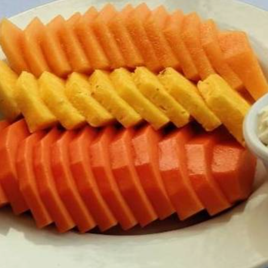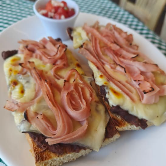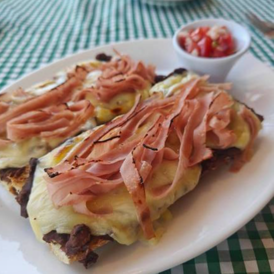Con frijoles refritos y gratinados, acompañados con salsa pico de gallo. Acompañados con jamón de pavo.