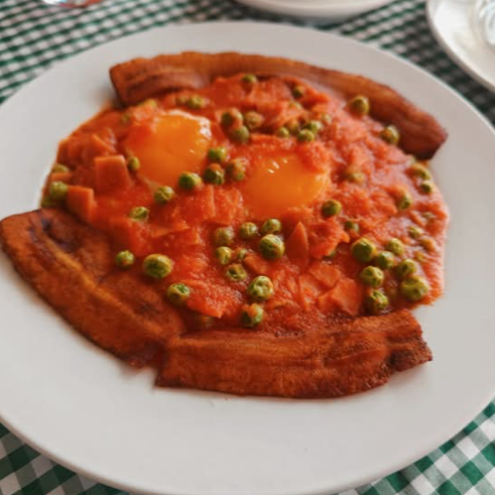En caldillo de jitomate con jamón y chicharos, plátano frito sobre tortilla.