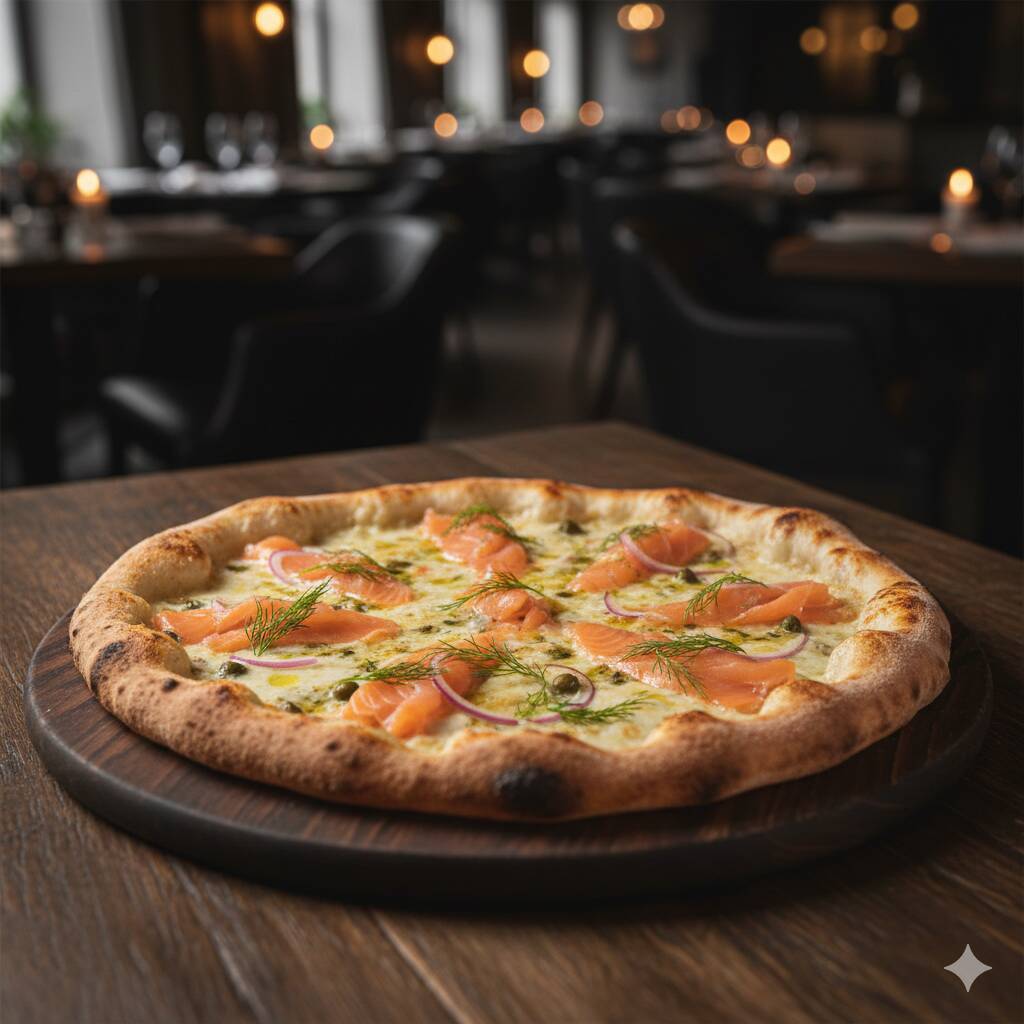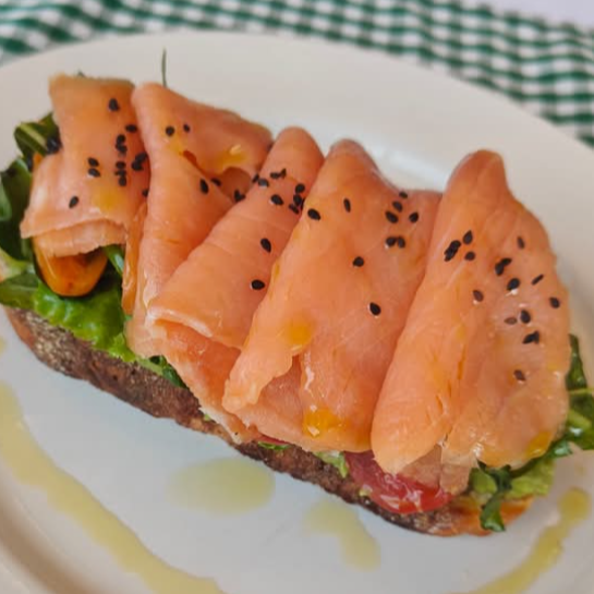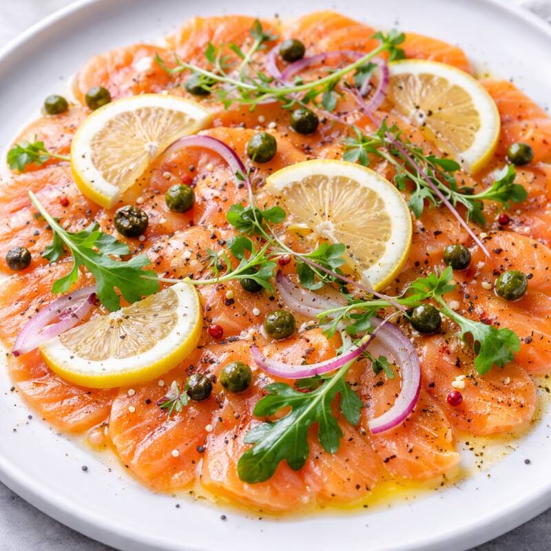 Finas láminas de salmón ahumado en vinagreta de vino tinto, alcaparrones, cherrys y arugula