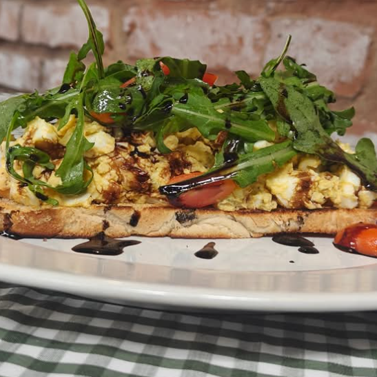 Pan tostado de la casa, egg salad, arugulany reducción de balsámico.