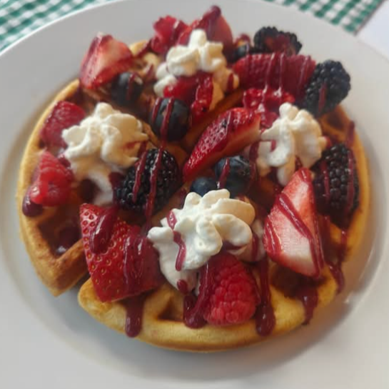 Servido con topping de frutos rojos y crema batida hecha en casa.