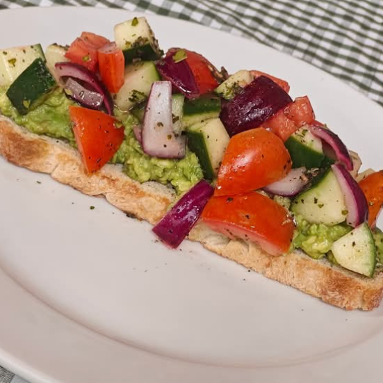 Pan tostado de la casa, con aguacate y ensalada mediterránea.