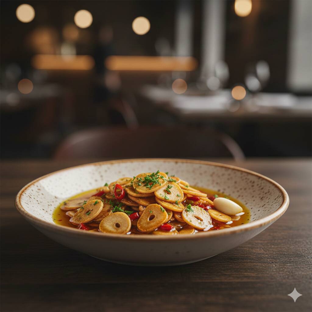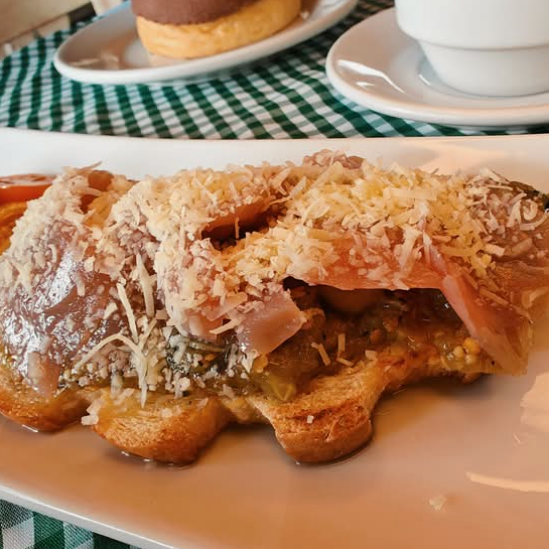 Pan tostado de la casa, puré de berenjena parmesano y reducción de balsámico.