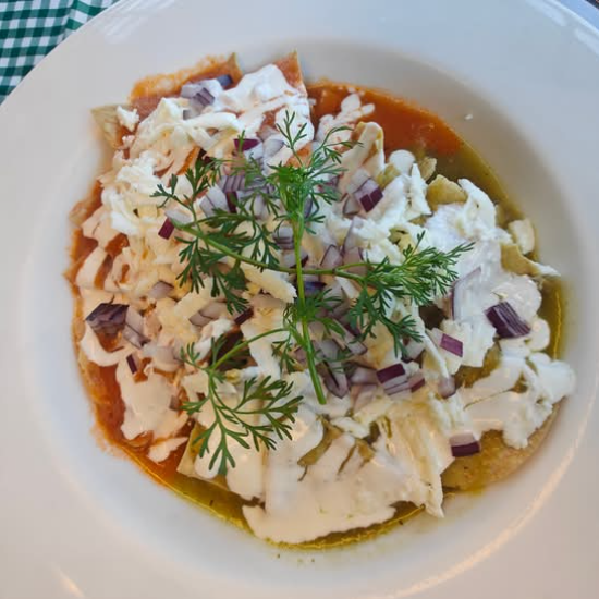 Chilaquiles rojos o verde, con crema, cebolla, queso y arrachera a la plancha.