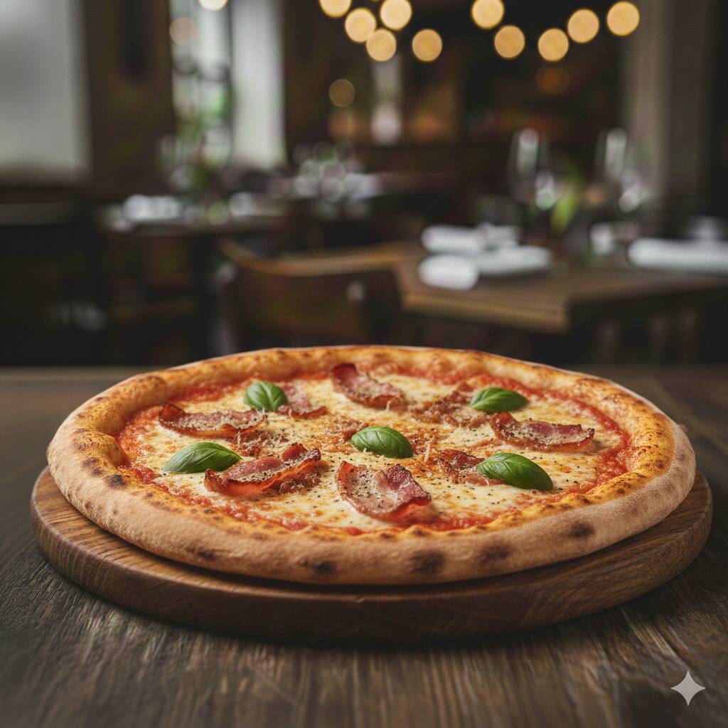 Con frijoles refritos y gratinados, acompañados con salsa pico de gallo. Acompañados con tocino.