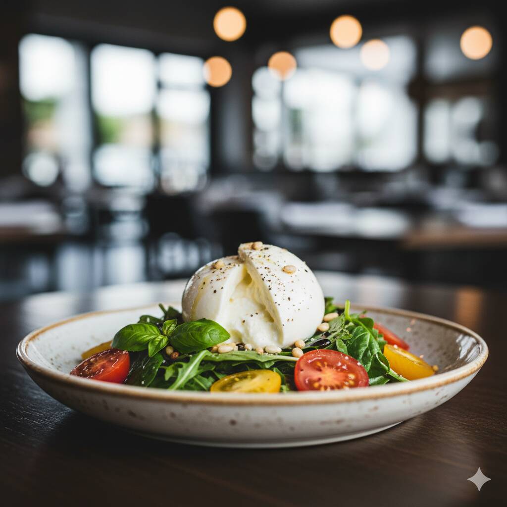 Rodajas de jitomate bola, con pesto y burrata fresca.