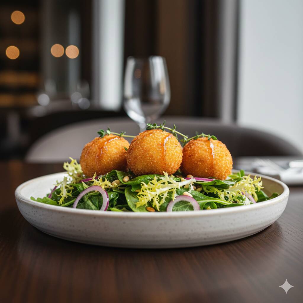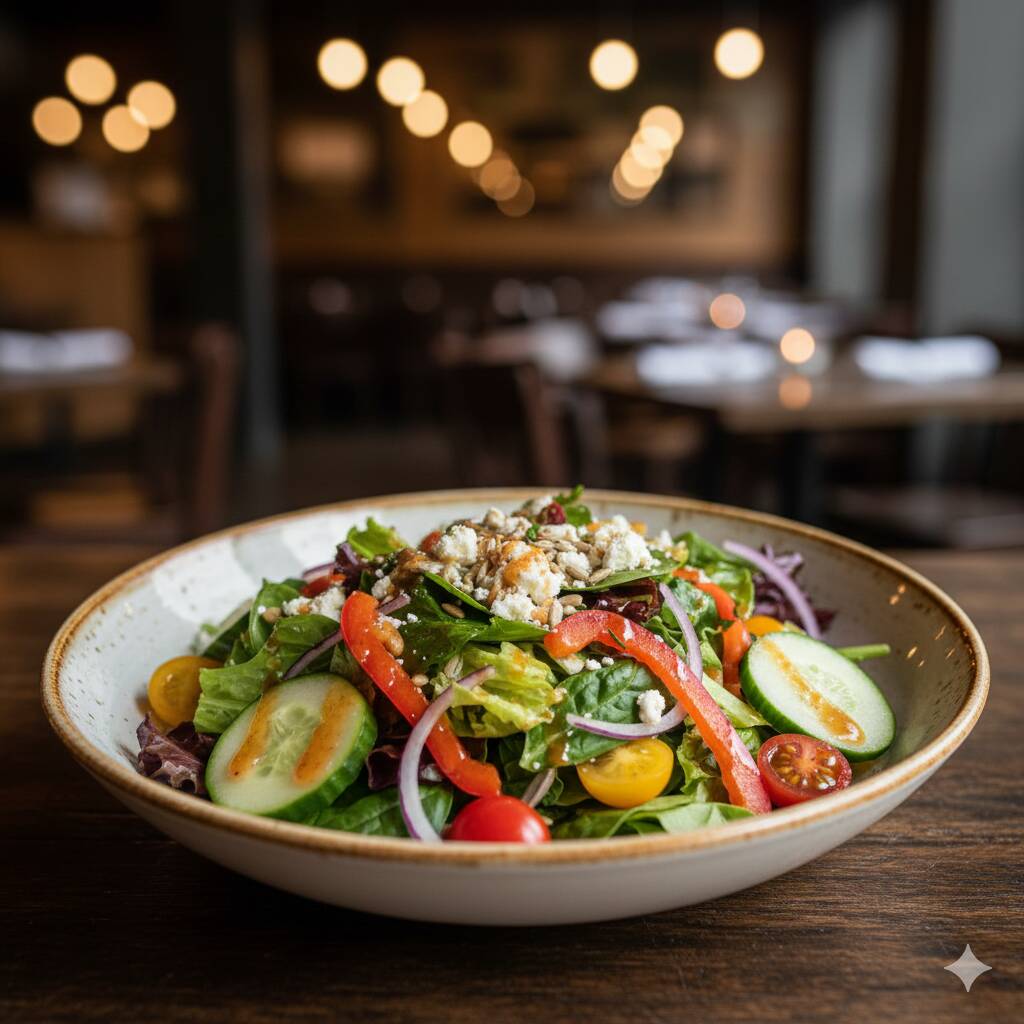 Mix de lechugas, manzana y aderezo de aceite de oliva, tomillo romero y vinagreta de vino tinto.