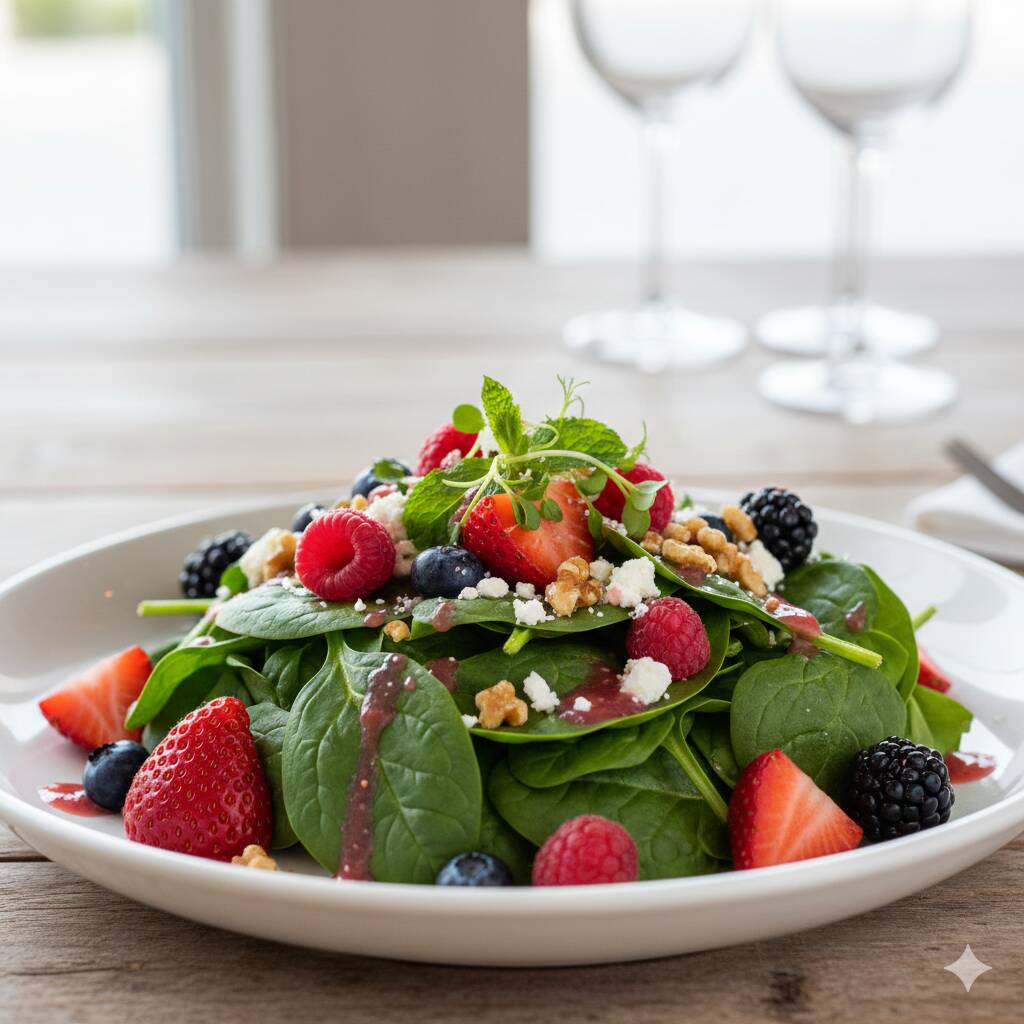 Espinacas, frutos rojos, nuez y queso de cabra aderezada con vinagreta de balsámico.
