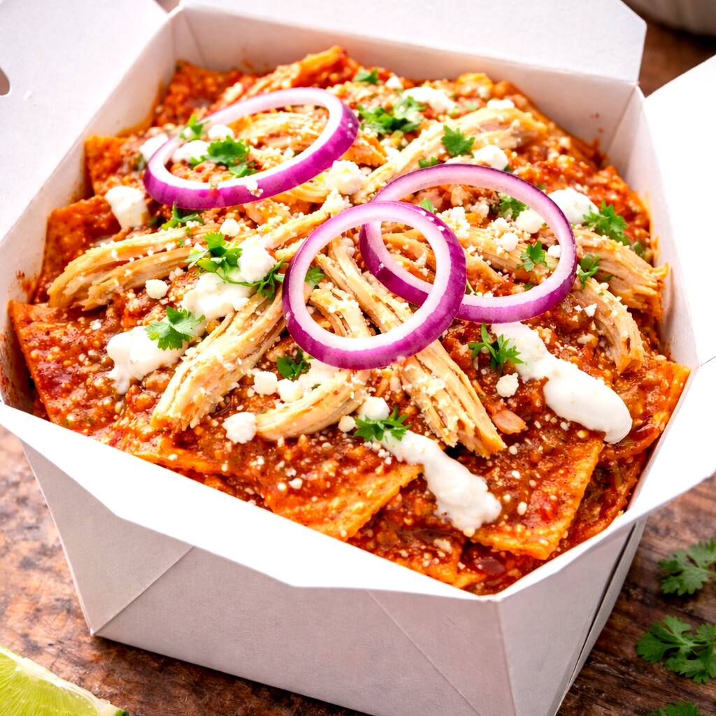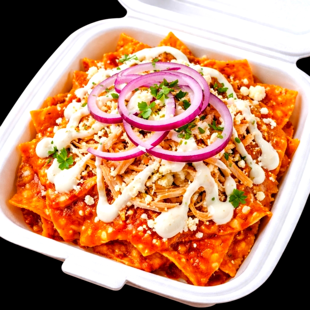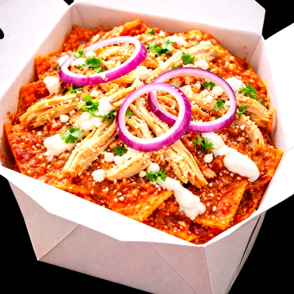 Deliciosos chilaquiles en salsa morita, pollo deshebrado, queso, crema, cebolla morada y pan.