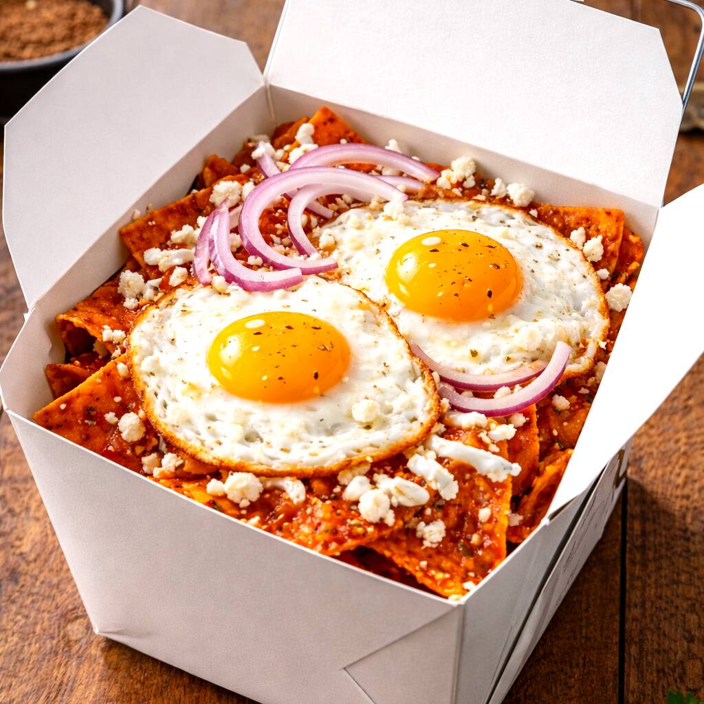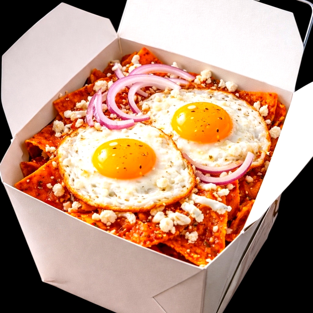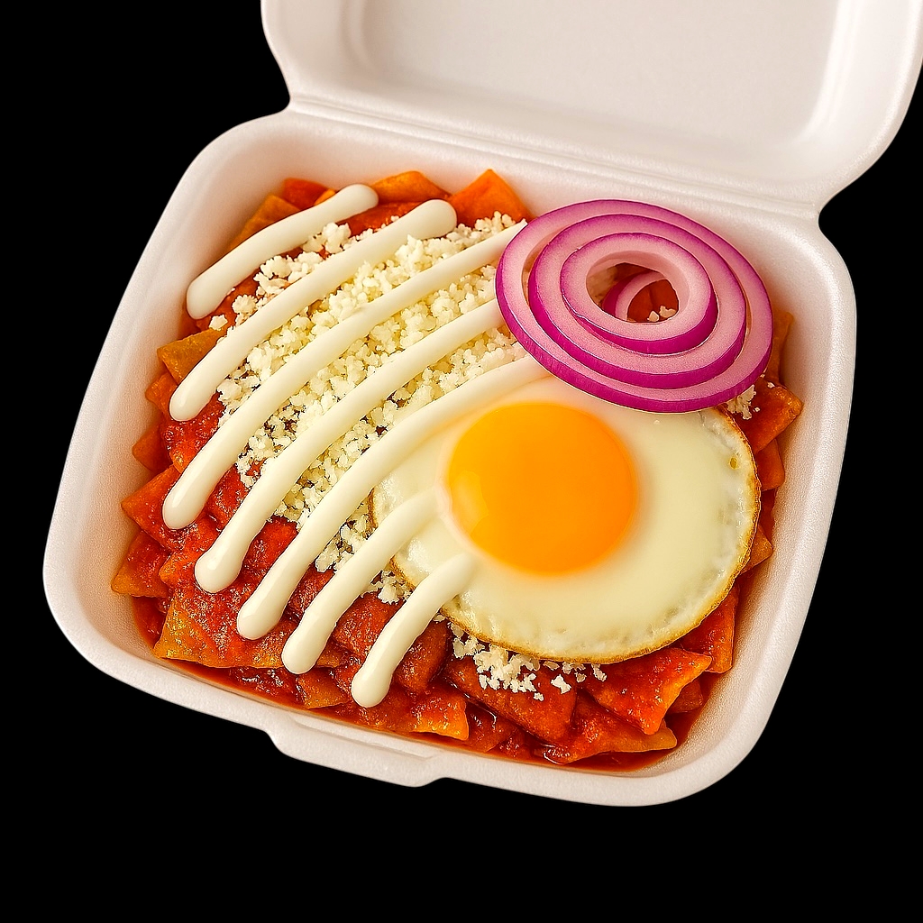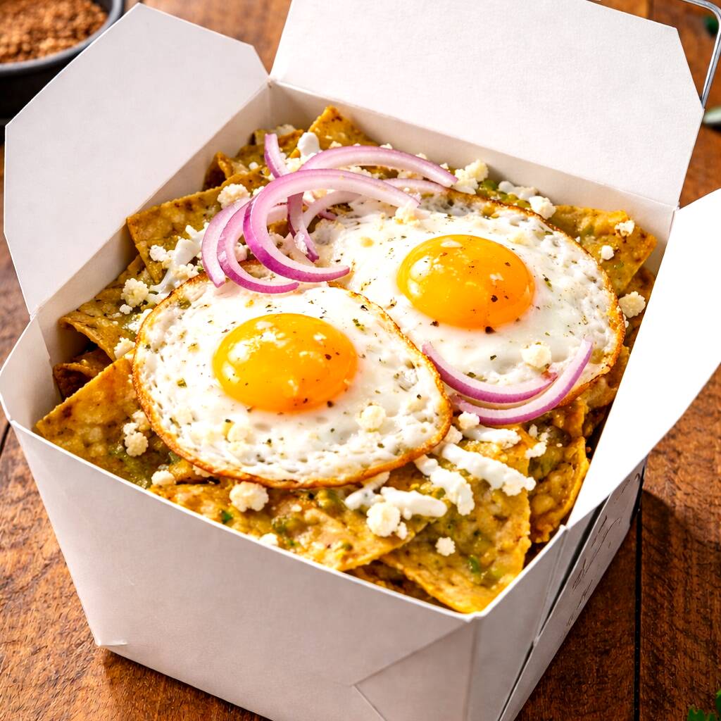 Misma cantidad, Nuevo empaque. Sabrosos chilaquiles con 2 huevos en salsa morita, queso, crema, cebolla .lrada y pan.