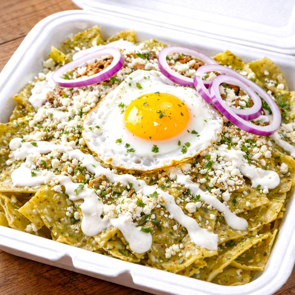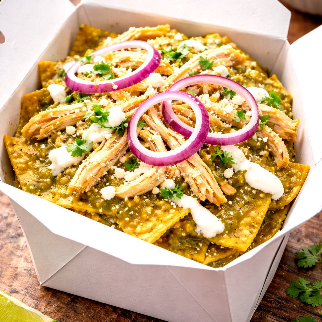 Sabrosos y nutritivos chilaquiles verdes con pollo, queso, crema, cebolla morada y pan.