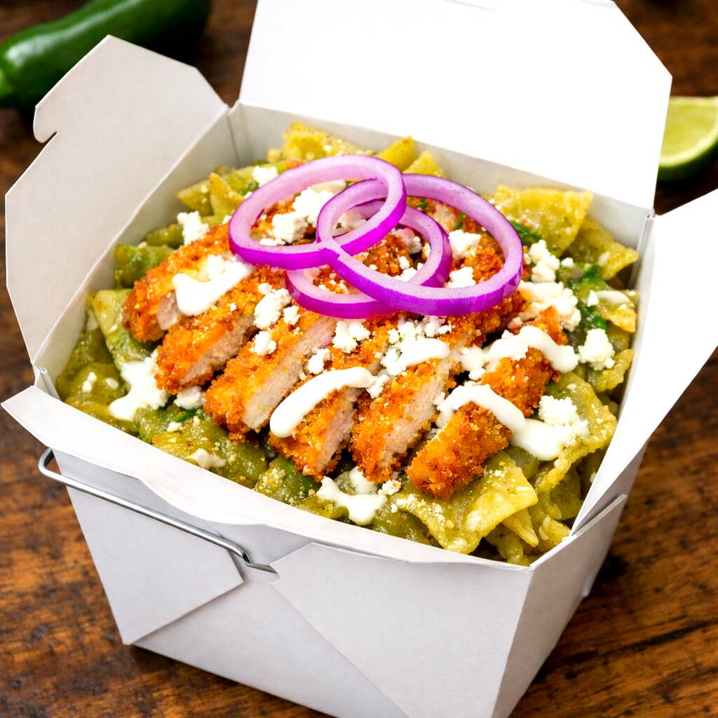 Deliciosos chilaquiles en salsa verde con milanesa, queso, crema, cebolla morada y pan.