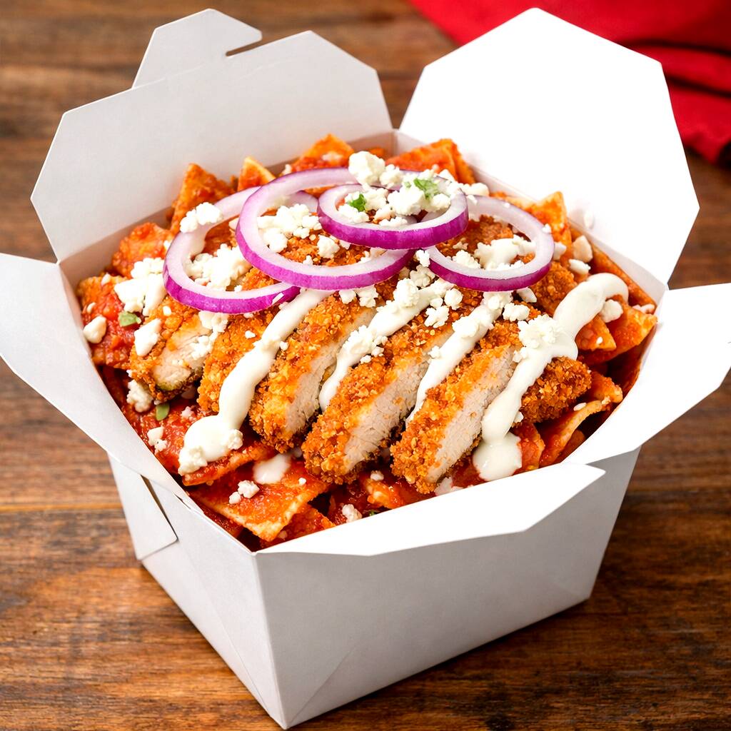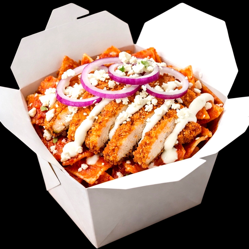 Misma cantidad, Nuevo empaque. Deliciosos y picosos chilaquiles en salsa habanera, milanesa, queso rallado, crema, cebolla morada, frijoles y pan.