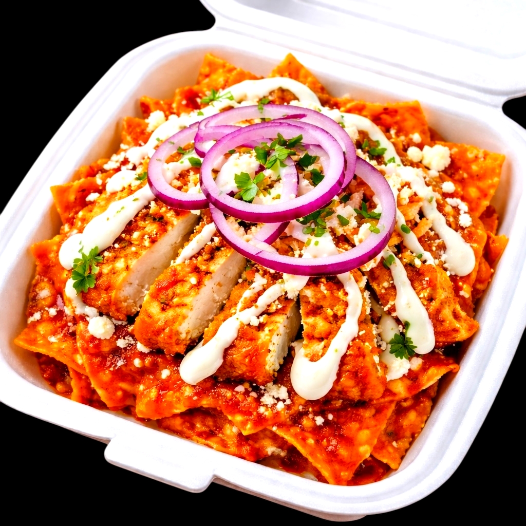 Deliciosos chilaquiles picositos en salsa habanera, milanesa, queso, crema, cebolla morada y pan.