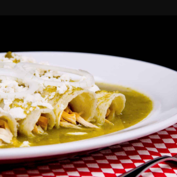 Enchiladas, tortillas rellenas cubiertas con salsa roja o verde, cebolla, queso y crema.