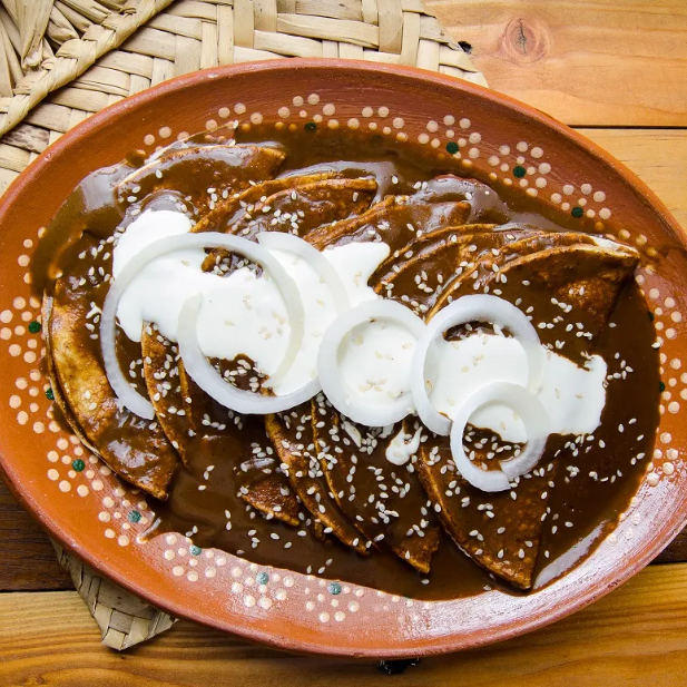 Enmoladas, tortillas rellenas de proteína, cubiertas de mole, crema, cebolla y ajonjolí.