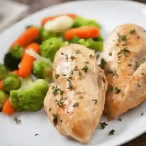 Pechuga de pollo al gusto, pechuga de pollo acompañada de brócoli, zanahorias y coliflor.