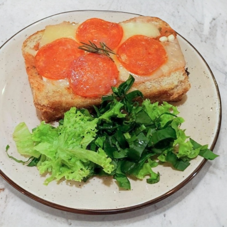 Sándwich caliente con mezcla de quesos, pepperoni, salsa de pizza y vegetales.