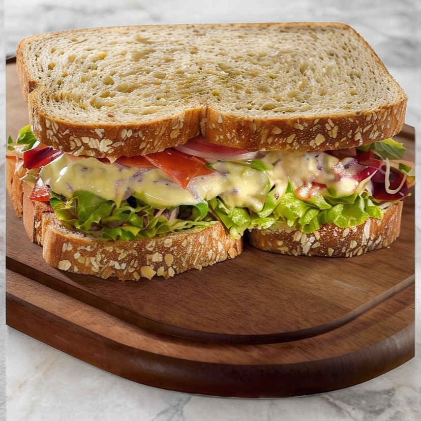 Sándwich en pan artesanal con pollo cremoso lemon pepper, jitomate, lechuga y cebolla. Acompañado de papas tipo chips.