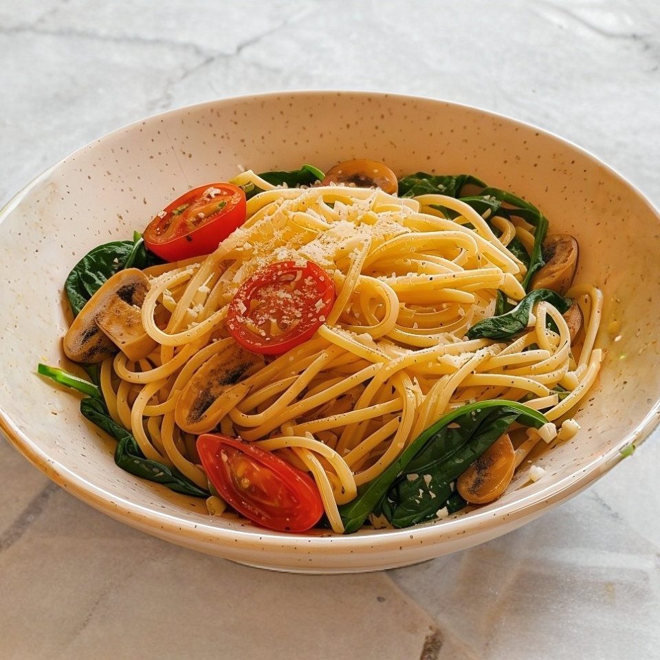 Pasta con espinaca, champiñones, jitomate cherry y queso parmesano.