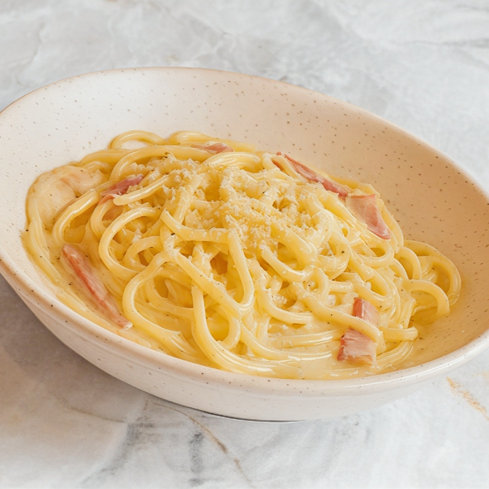 Pasta en salsa blanca cremosa de la casa con tocino.