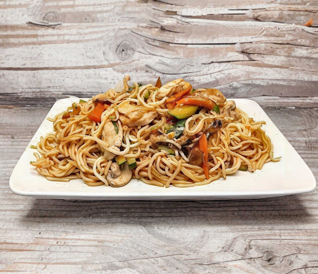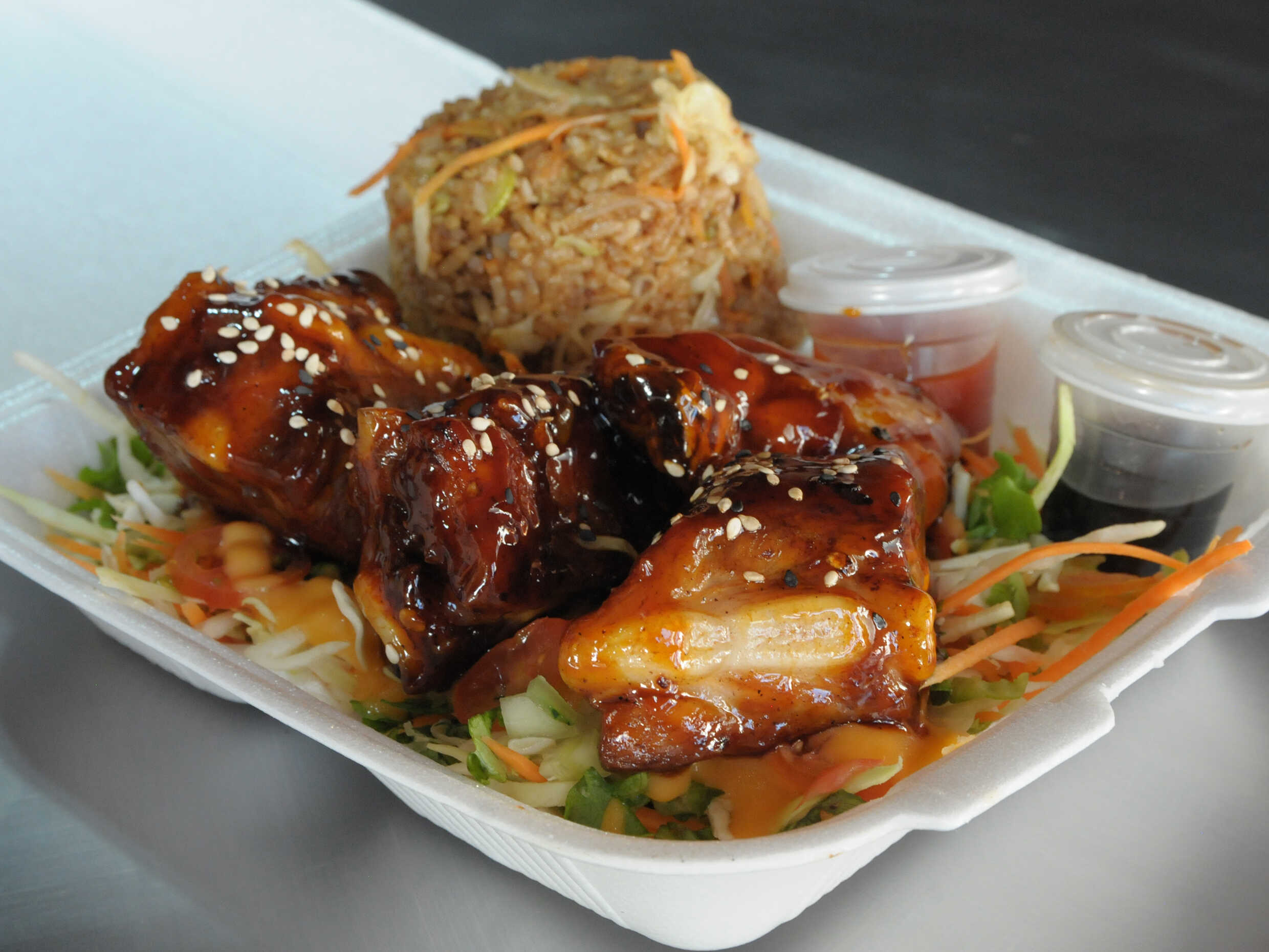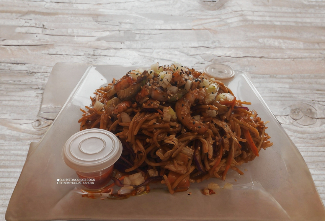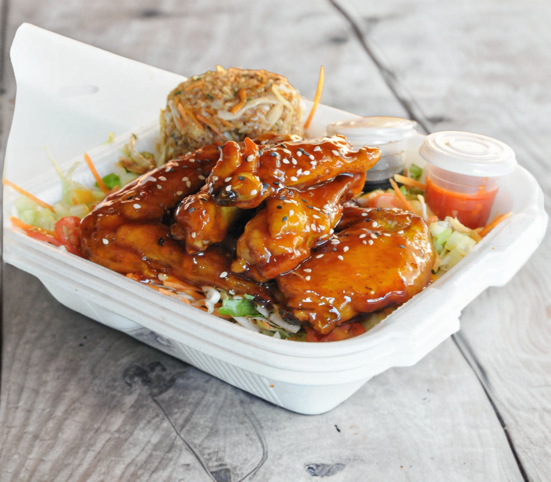(Platillo personal) incluye: Pollo ( 250 gramos), contiene Arroz ( 2 tazones), salsa soya, limón, salsa sanbal.