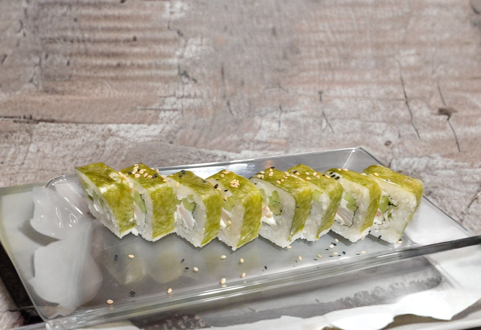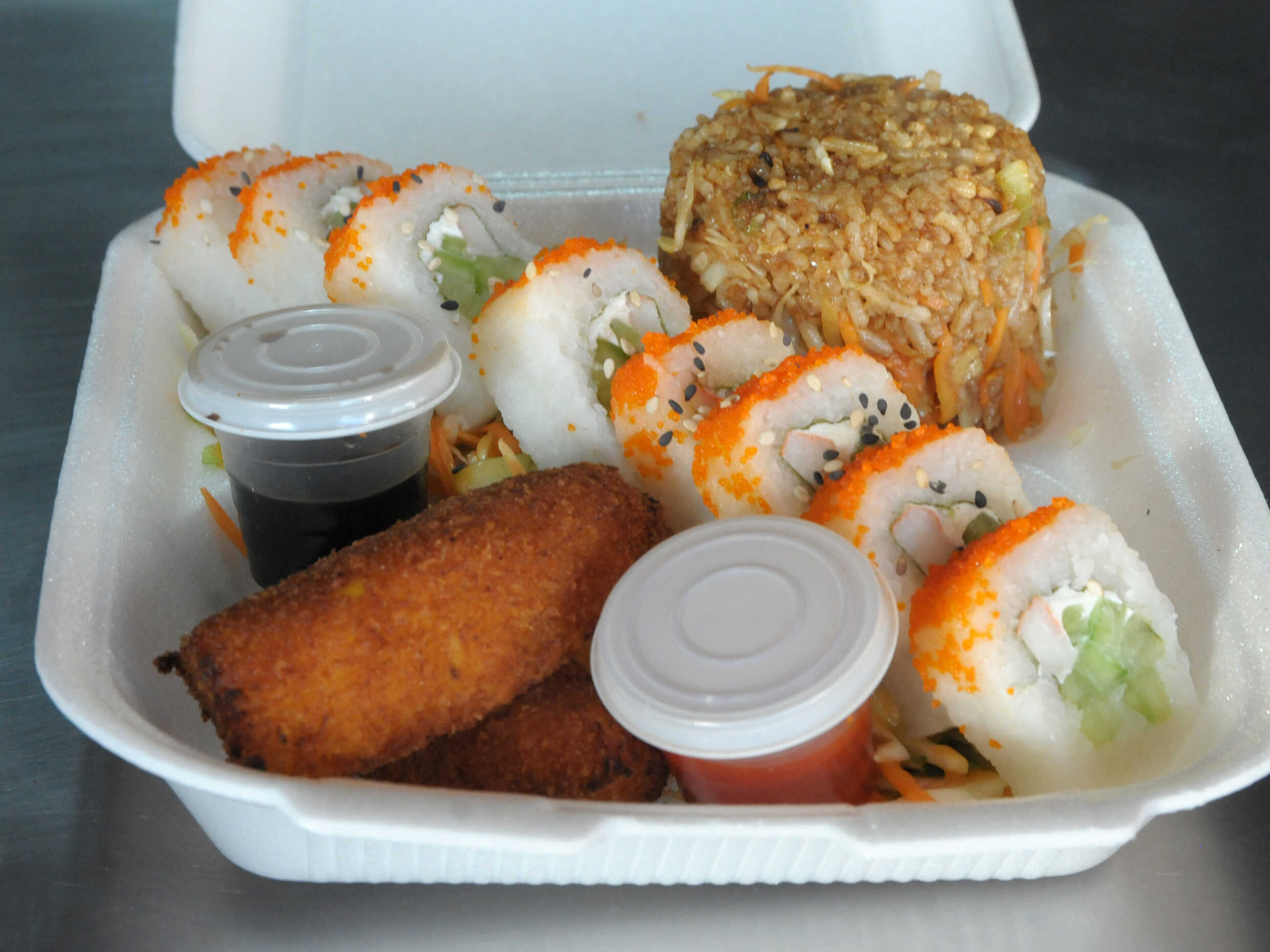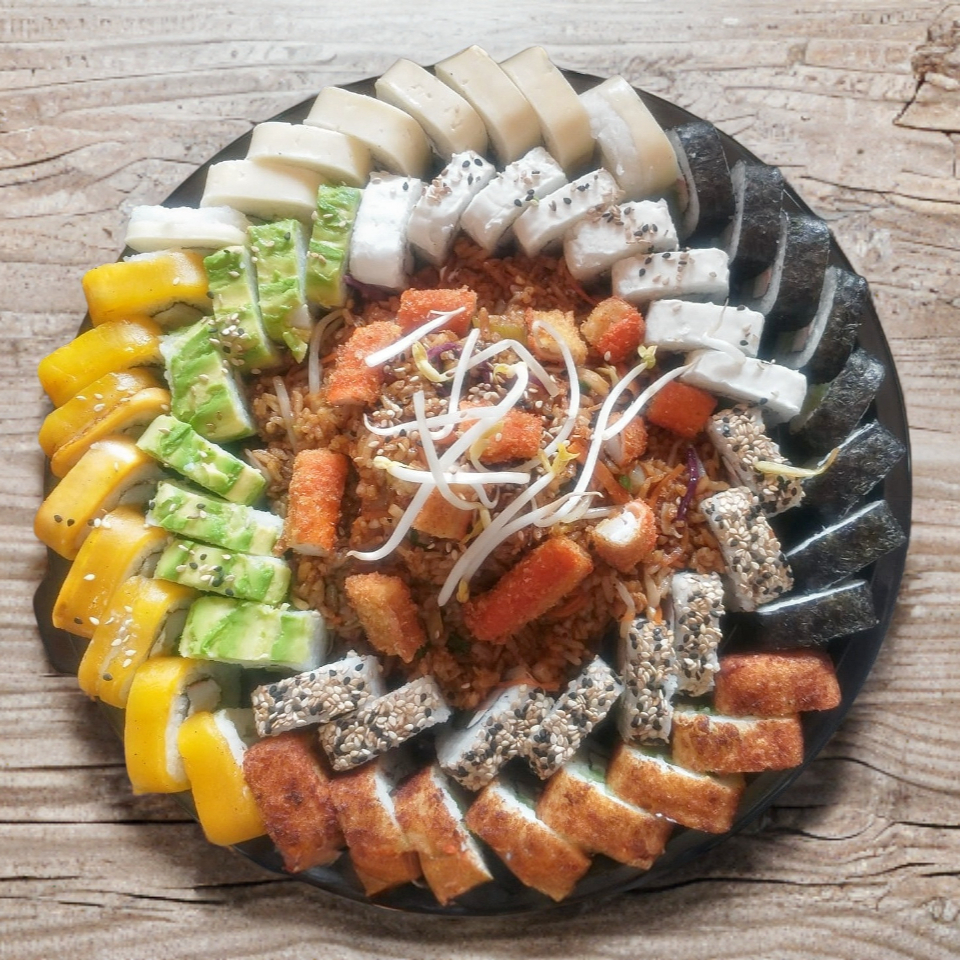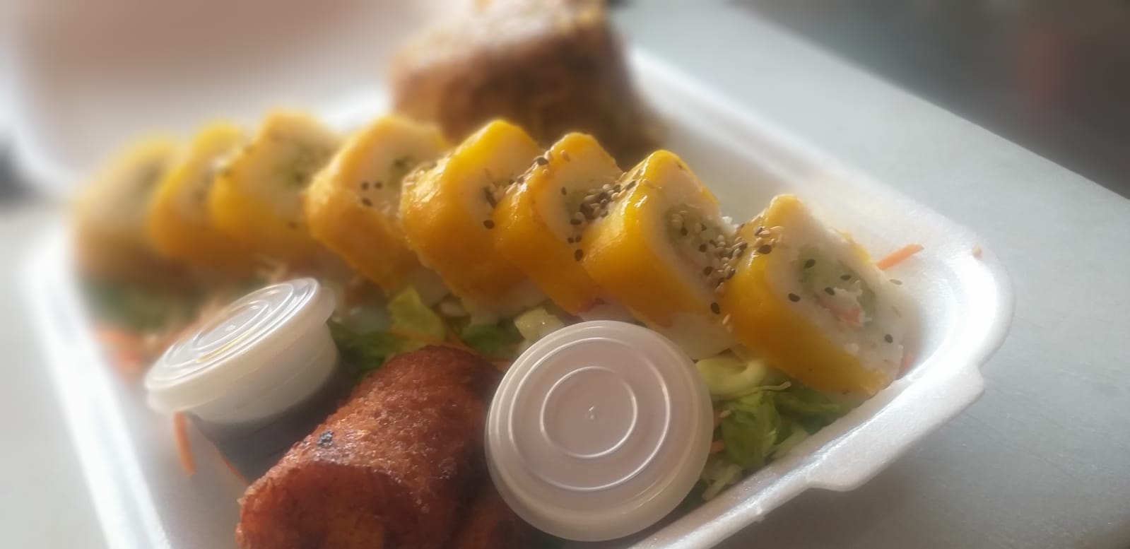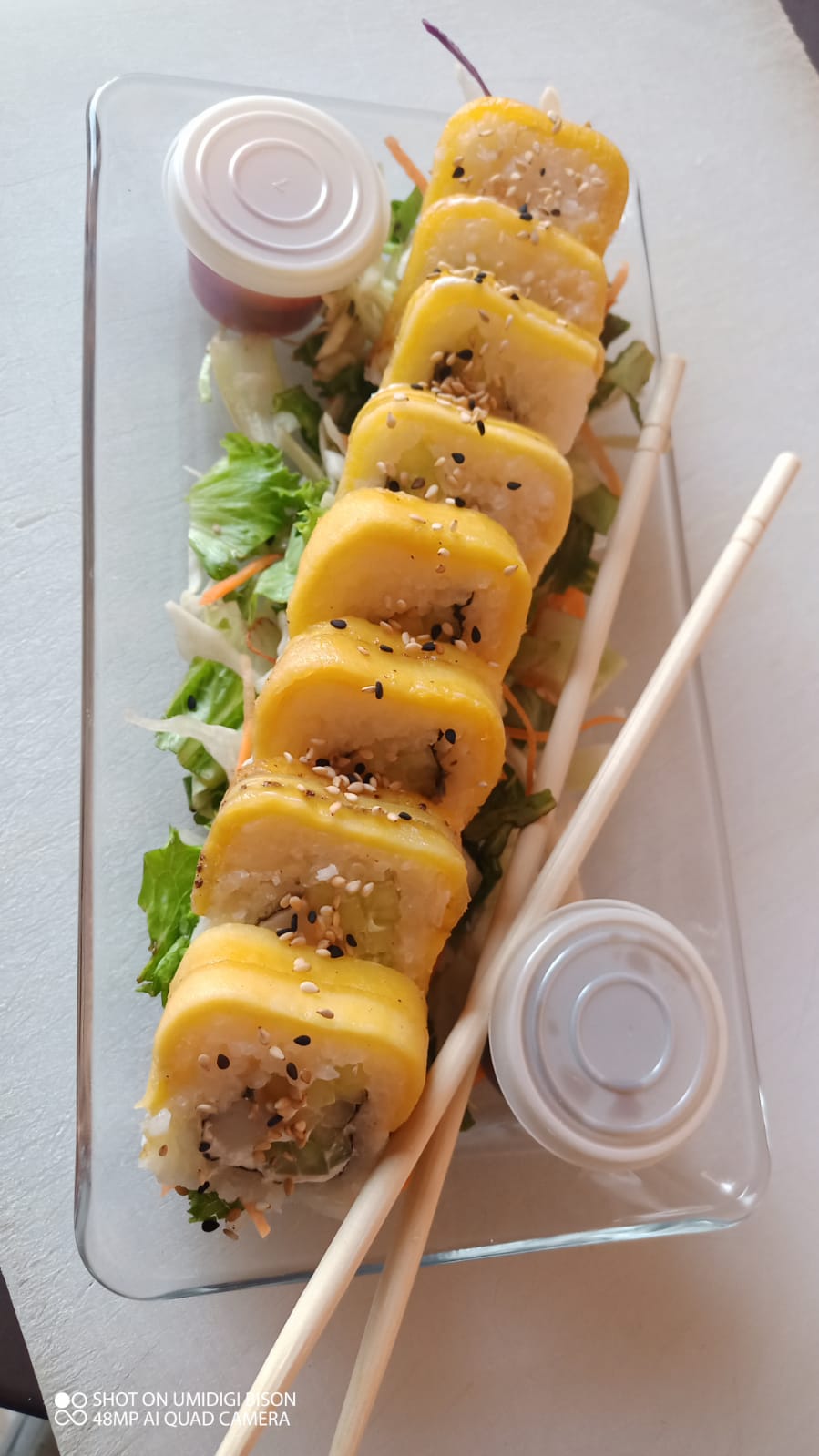 rollo de sushi empanizado ensaladas, arroz y dos brochetas de plátano