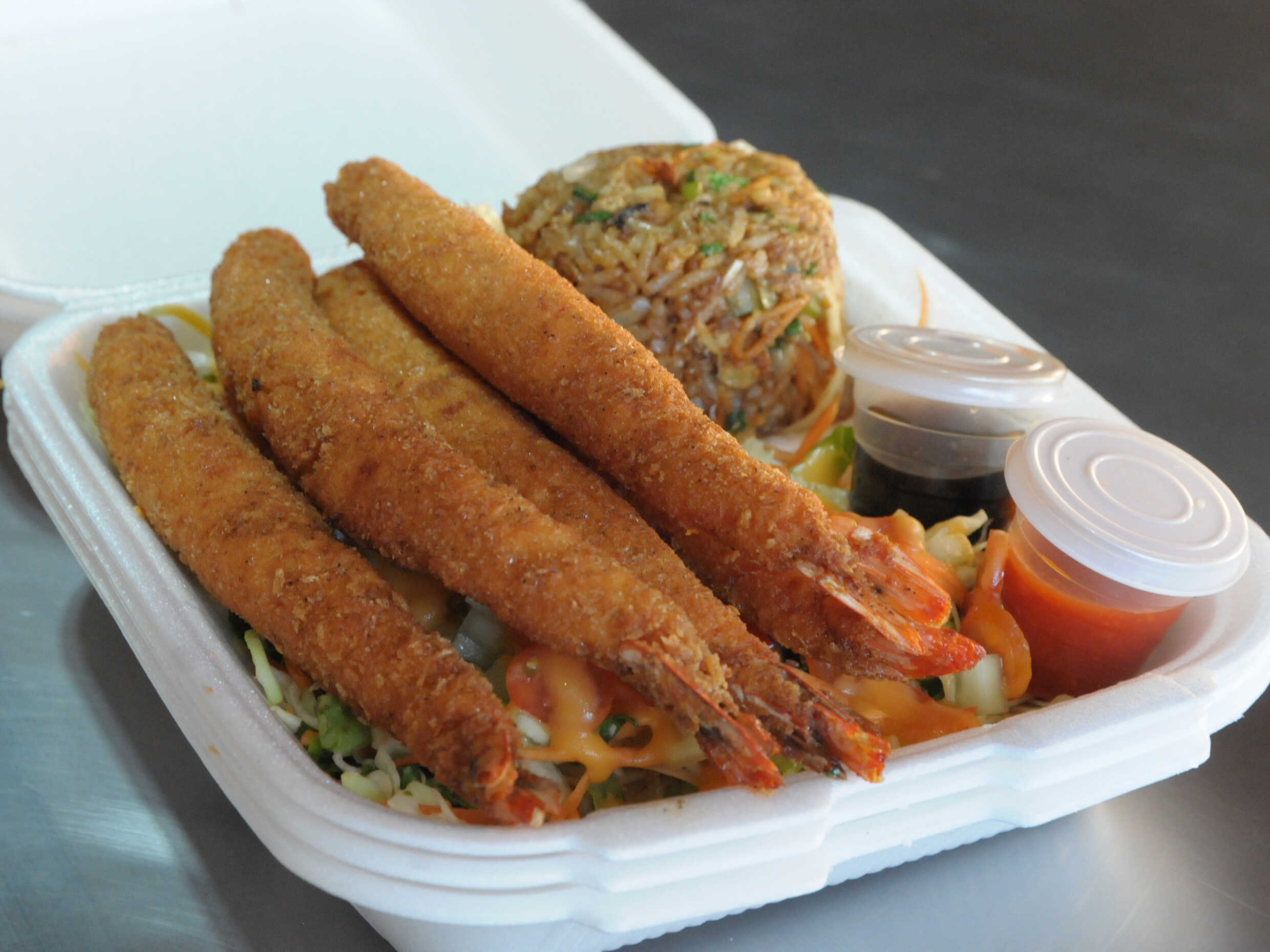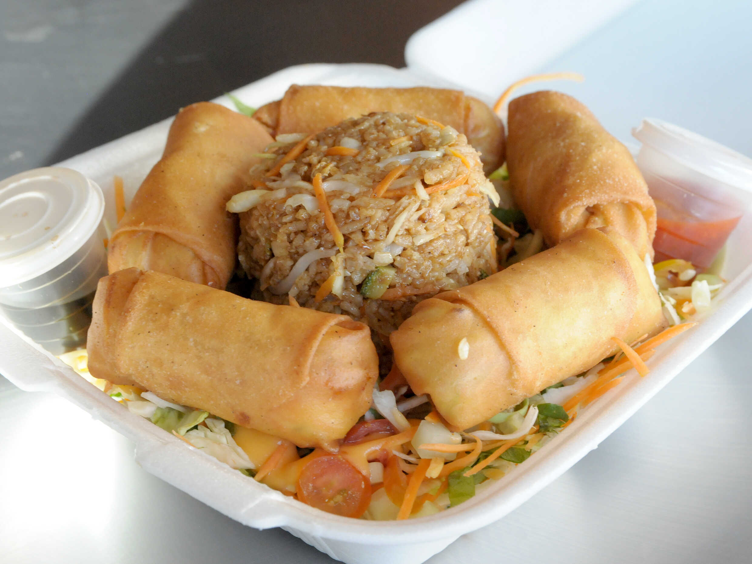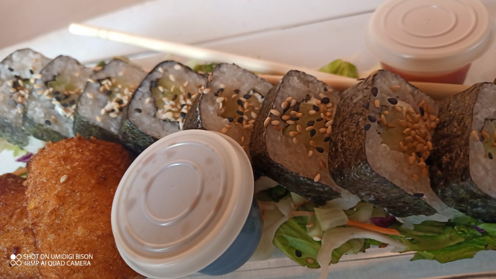 5 Piezas, con arroz frito y ensalada italiana, col rayada, zanahoria y se acompaña con pepino.