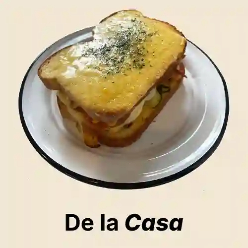 Pan gratinado con queso gouda, jamón serrano, queso manchego, manzana, mostaza y mayonesa.