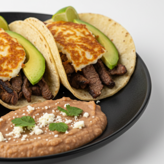 Sirloin picado, frijoles, costra de queso crujiente y aguacate fresco.
