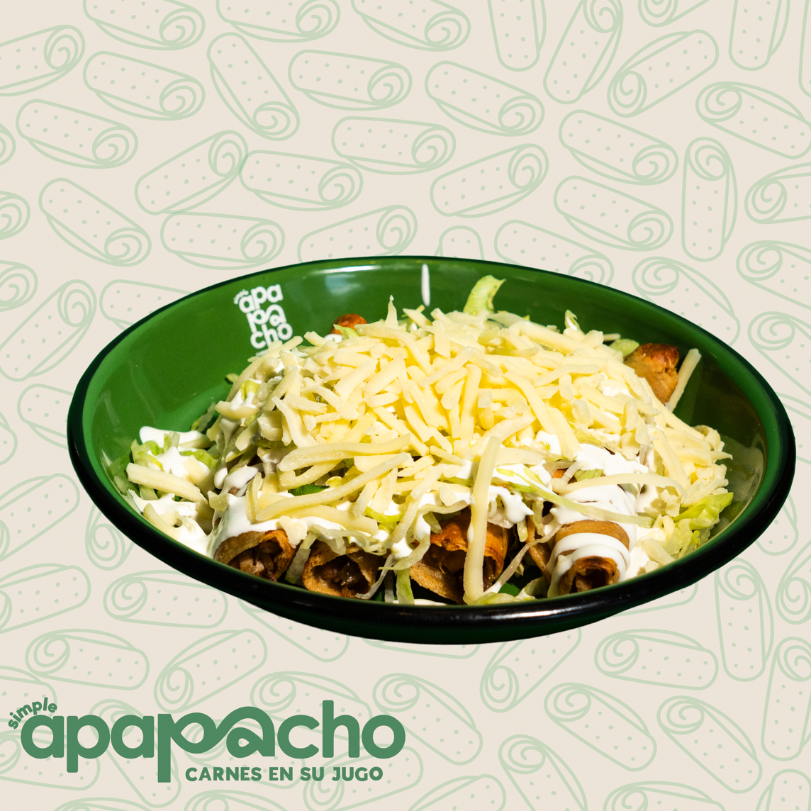 Crujientes por fuera, jugosos por dentro . 4 tacos doraditos de pollo, acompañados de lechuga fresca, crema y queso.