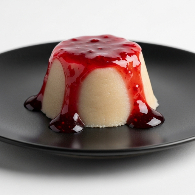Cremosa. Con sabor a mazapán y coulis de fresa natural arriba.
