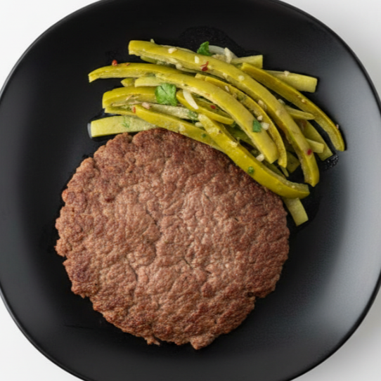 Carne molida aplanada y dorada, acompañada de nopales guisados