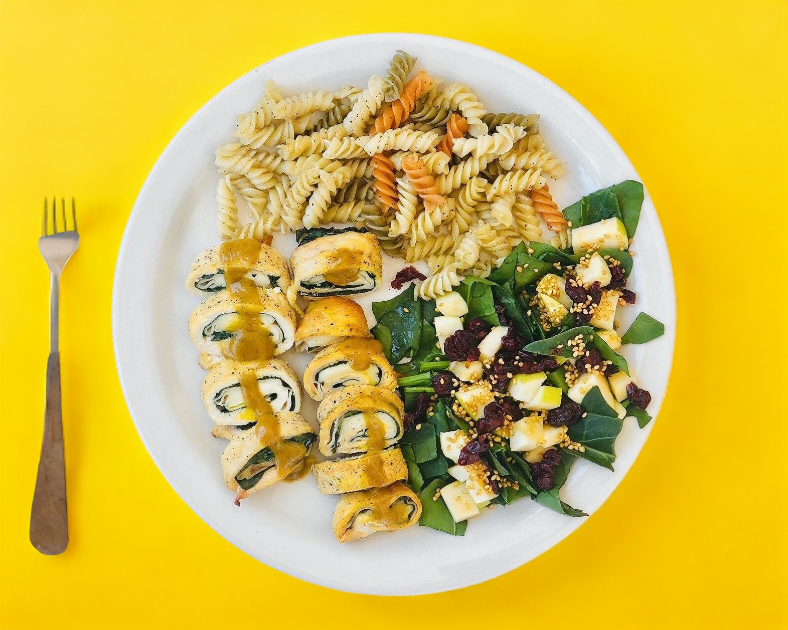 Pechugas rellenas de queso panela, pechuga pavo, espinaca. Acompañada de ensalada de la casa y pasta a las finas hierbas.