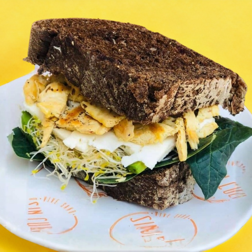 Pan de centeno, espinaca, germen de alfalfa, jitomate, aguacate, queso panela
