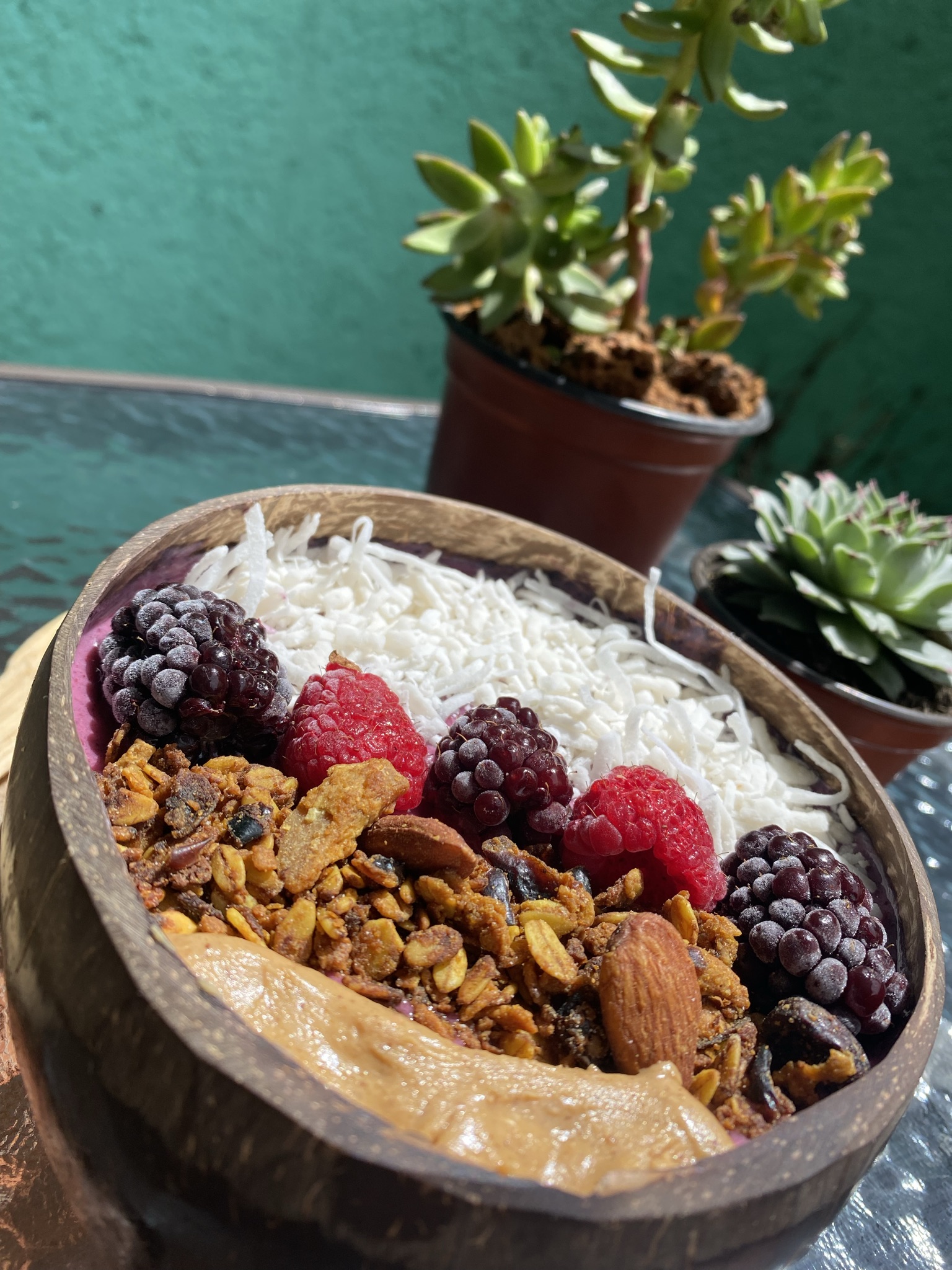 Batido de frutos rojos, topping de frambuesa, granola, crema de cacahuate y coco.