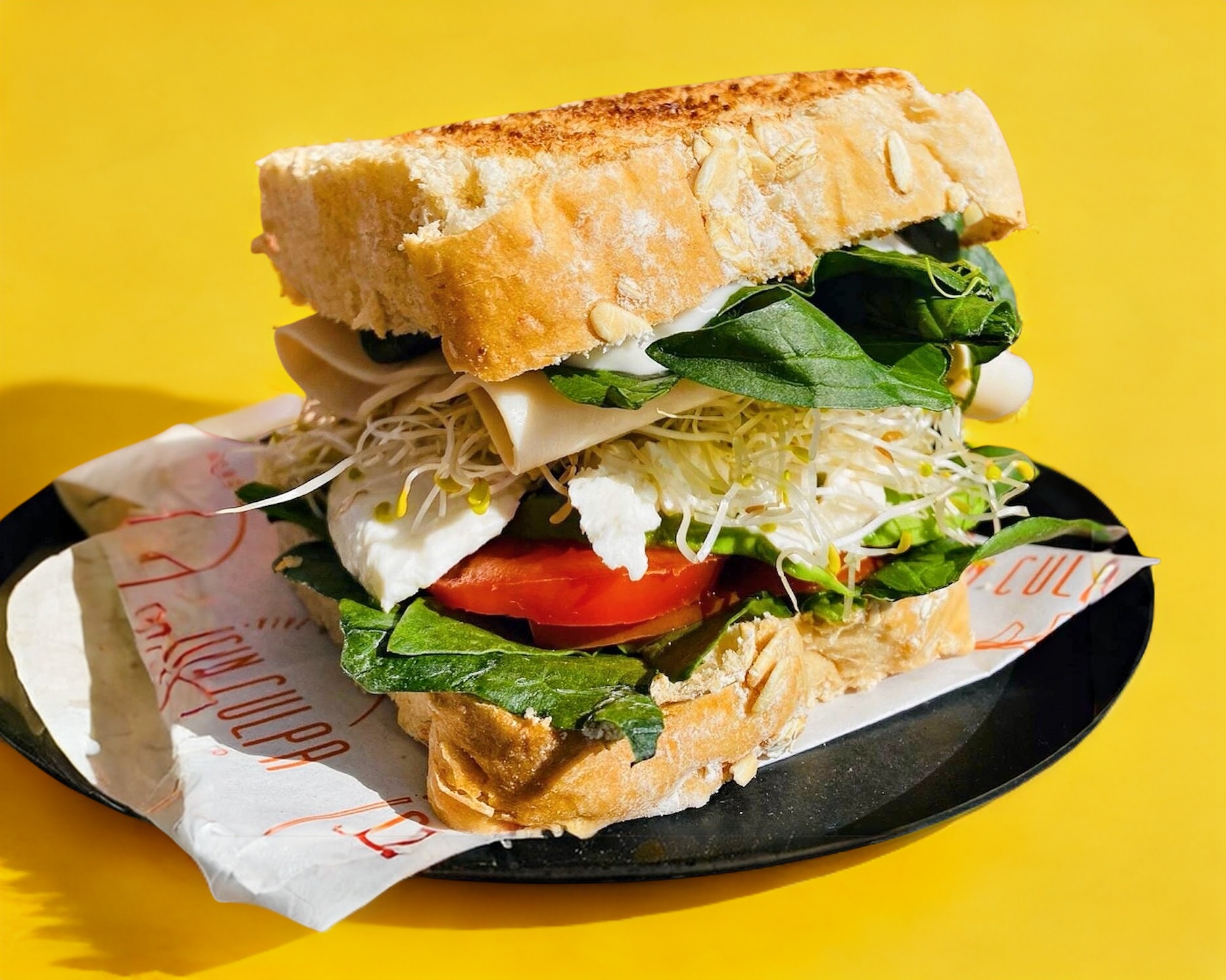 Pan de avena c/ chia, espinaca, germen de alfalfa, jitomate, aguacate, queso panela.