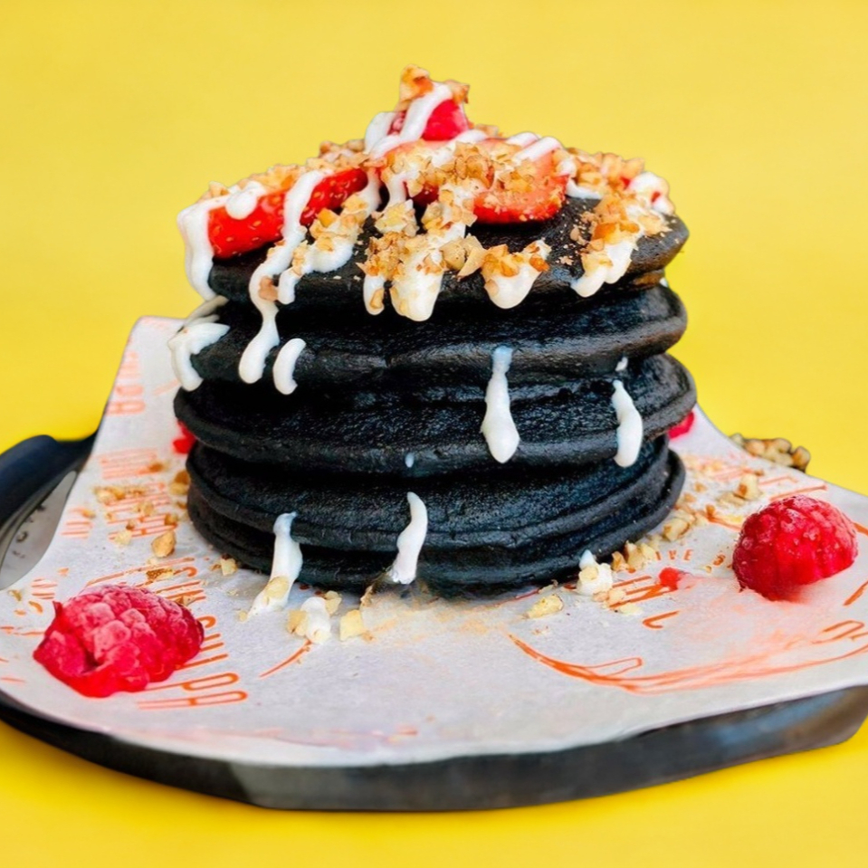 Hot cakes hechos a base de carbon activado. Inlcuye frutos rojos, amaranto y miel organica.