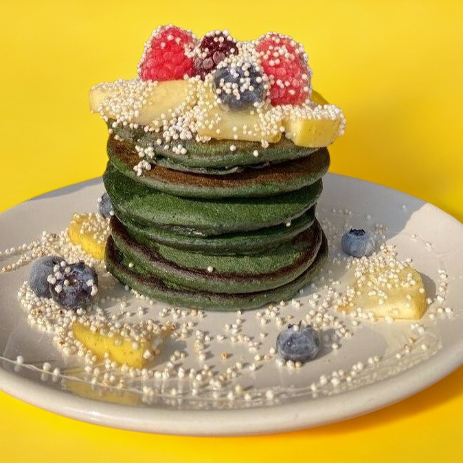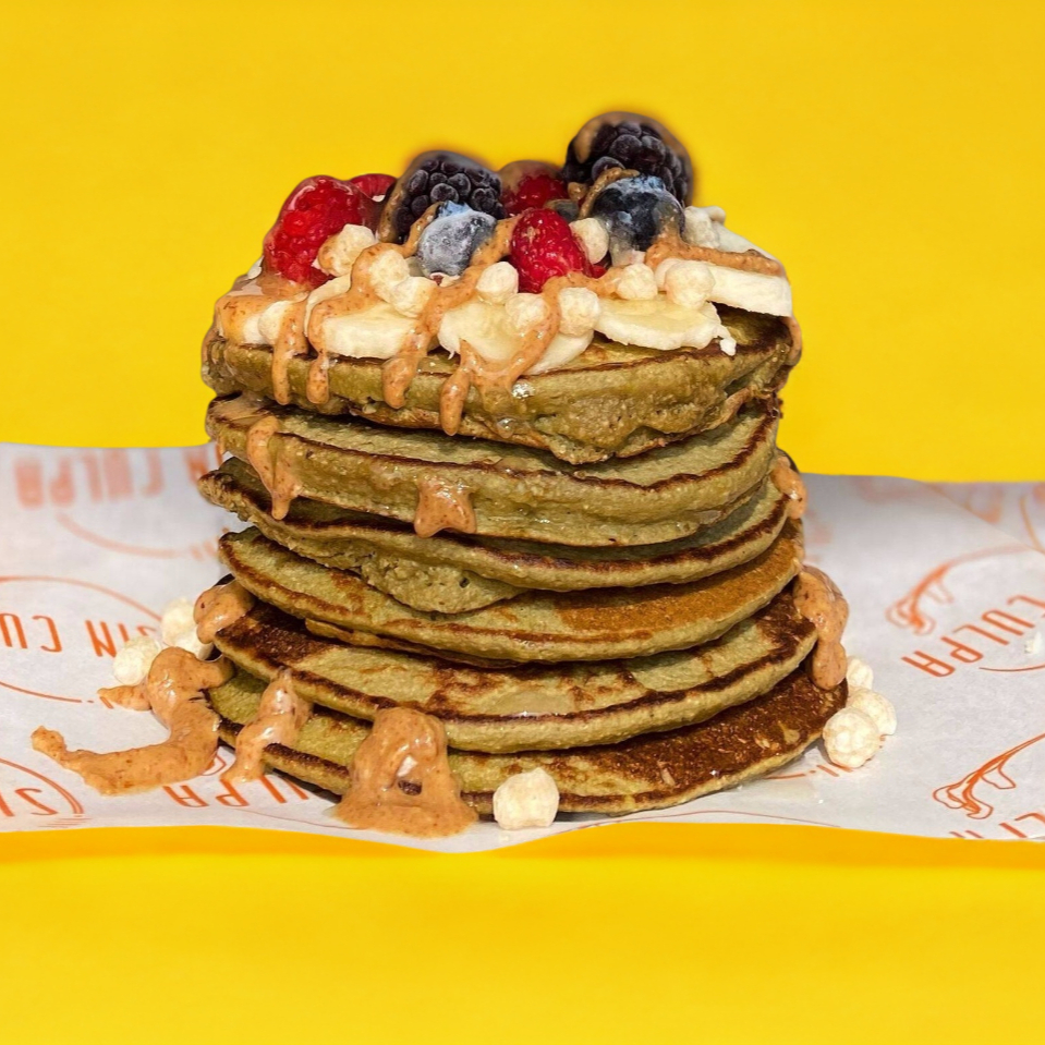 Hot cakes saludables de Matcha, cubiertos de plátano, frutos rojos, crema de almendras y quinoa crispy.