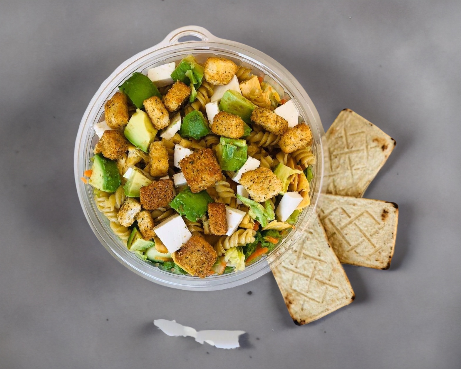 Lechuga, espinaca, germen alfalfa, pepino, zanahoria, pasta, crutones, aguacate, queso panela, manzana, fresa, atun sellado.