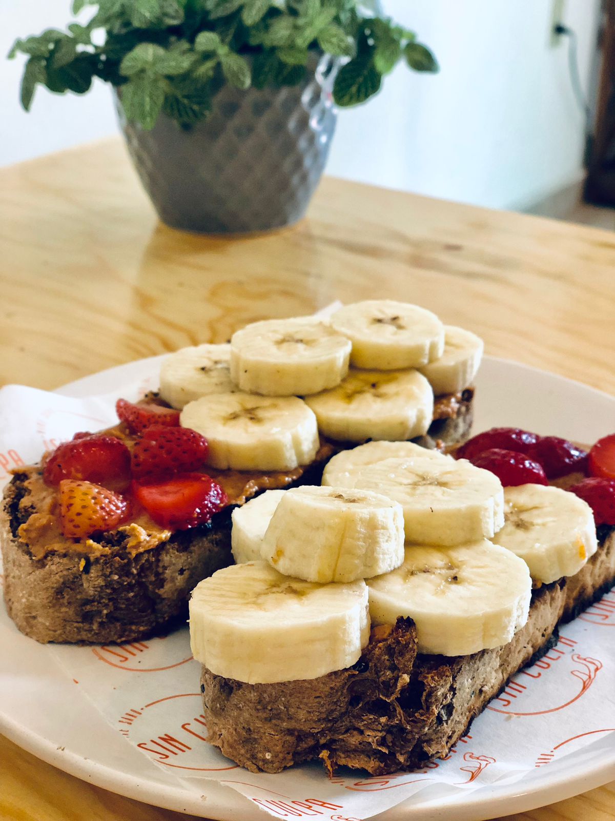 Hogaza de pan rustico con crema de cacahuate, fresa y plátano.