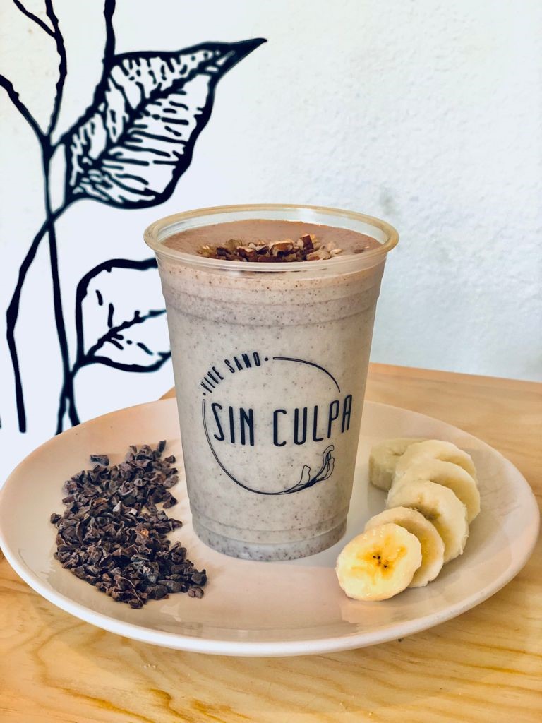 Batido de cacao, plátano y amaranto, topping de almendra fileteada, manzana, cacao nibs, crema de cacahuate.