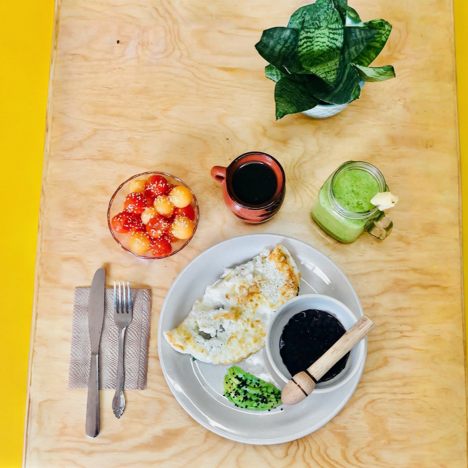 Omelette de claras de huevo, relleno de pechuga de pavo, espinaca y queso panela. Acompañado de frijoles y aguacate.